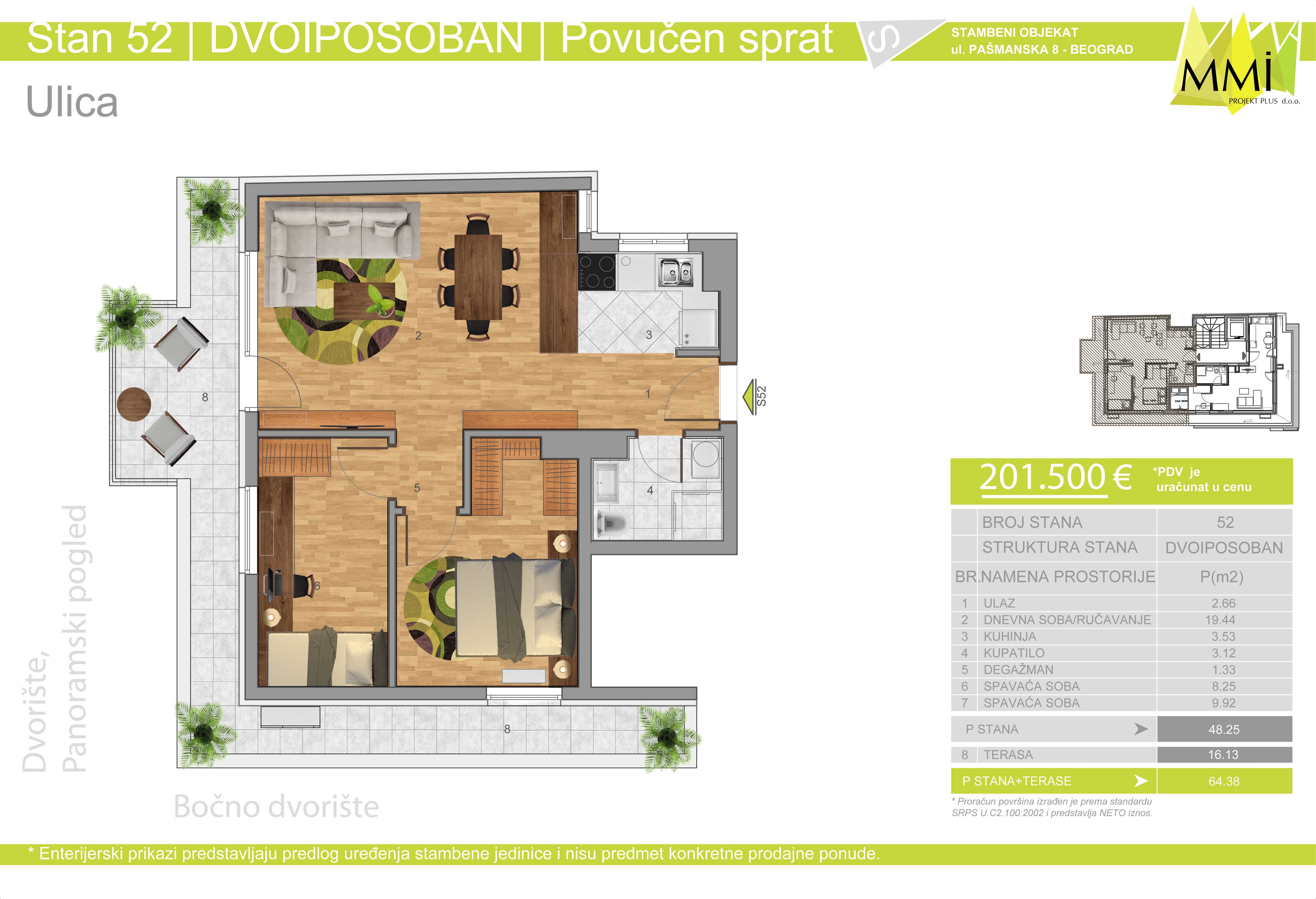 Savremen stan sa dnevnim boravkom, dve spavaće sobe i velikom terasom.