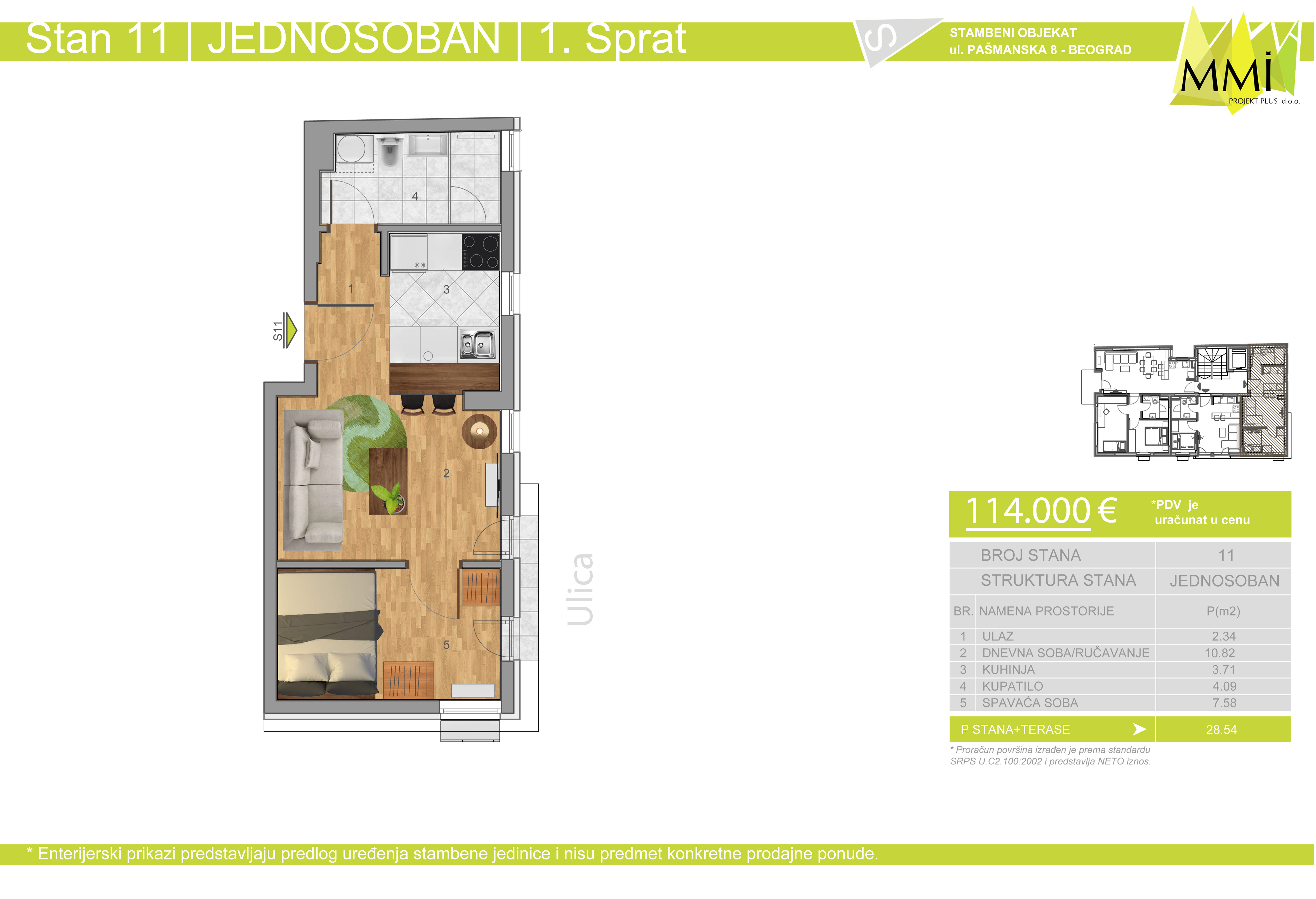 Savremen, optimalno organizovan stan, minimalne kvadrature, sa integrisanim dnevnim boravkom i kuhinjom, manjom spavaćom sobom i kupatilom.