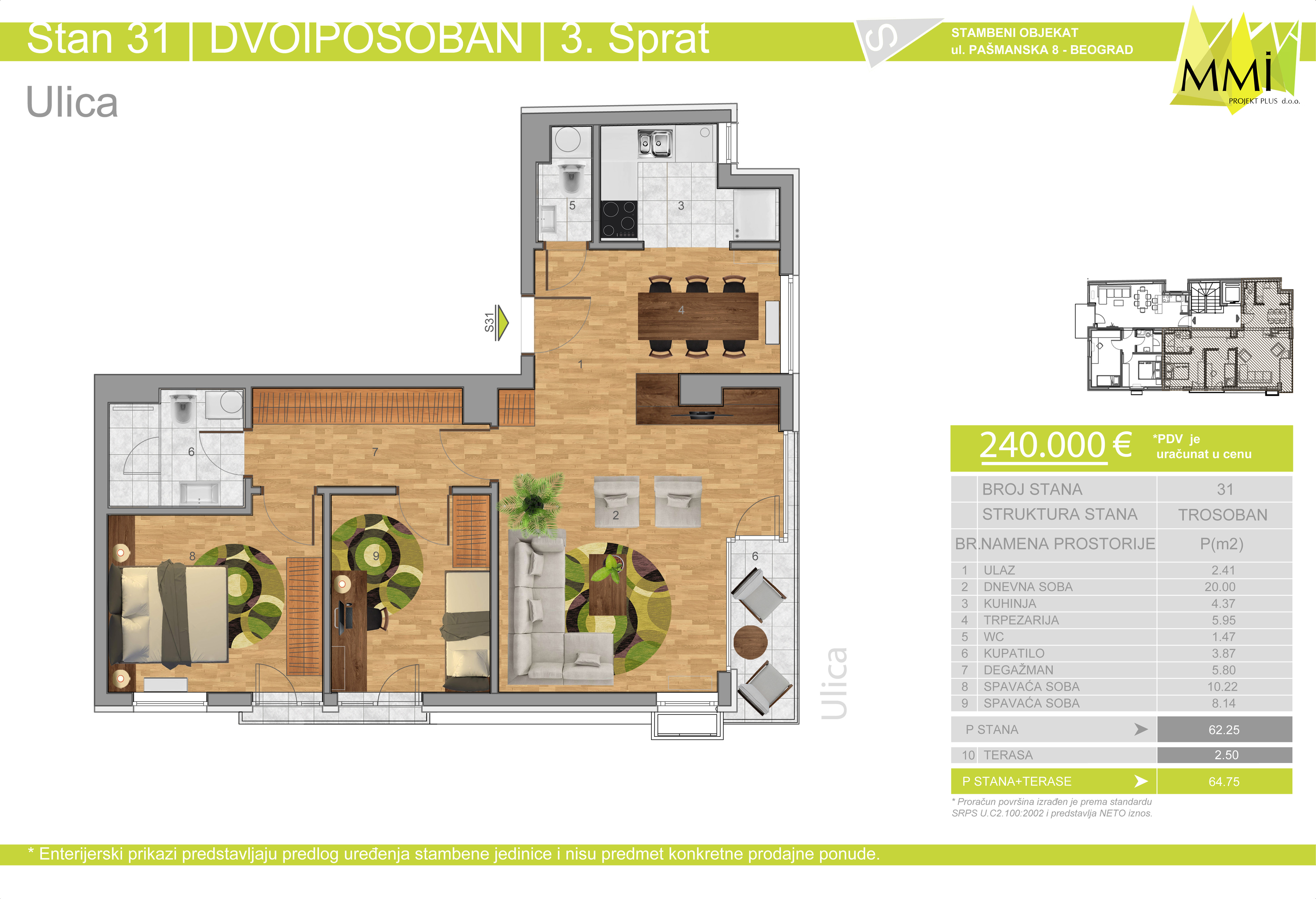 Savremen luksuzan stan sa dnevnim boravkom, dve spavaće sobe, terasom orijentisanom ka drvoredu u Pašmnskoj ulici.